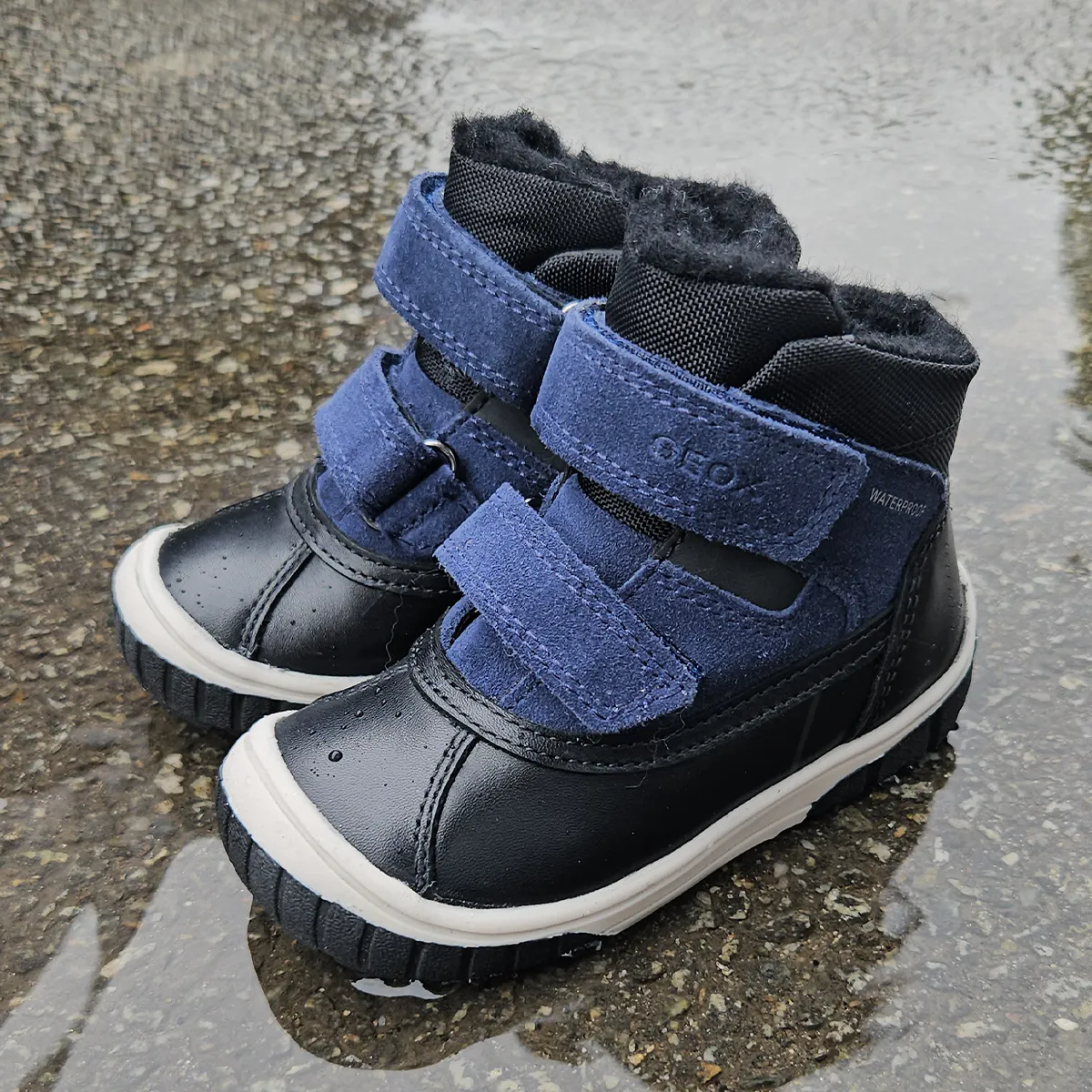 Ghete impermeabile pentru baieti, concepute să le ofere stabilitate și încredere la primii pași. Acest model Omar este realizat din piele și piele întoarsă, într-o combinație elegantă de negru și bleumarin, și dispune de sistem de prindere reglabil. Oferă confort deplin la joacă și în activitățile de zi cu zi, protejând piciorușele chiar și în cele mai umede condiții.