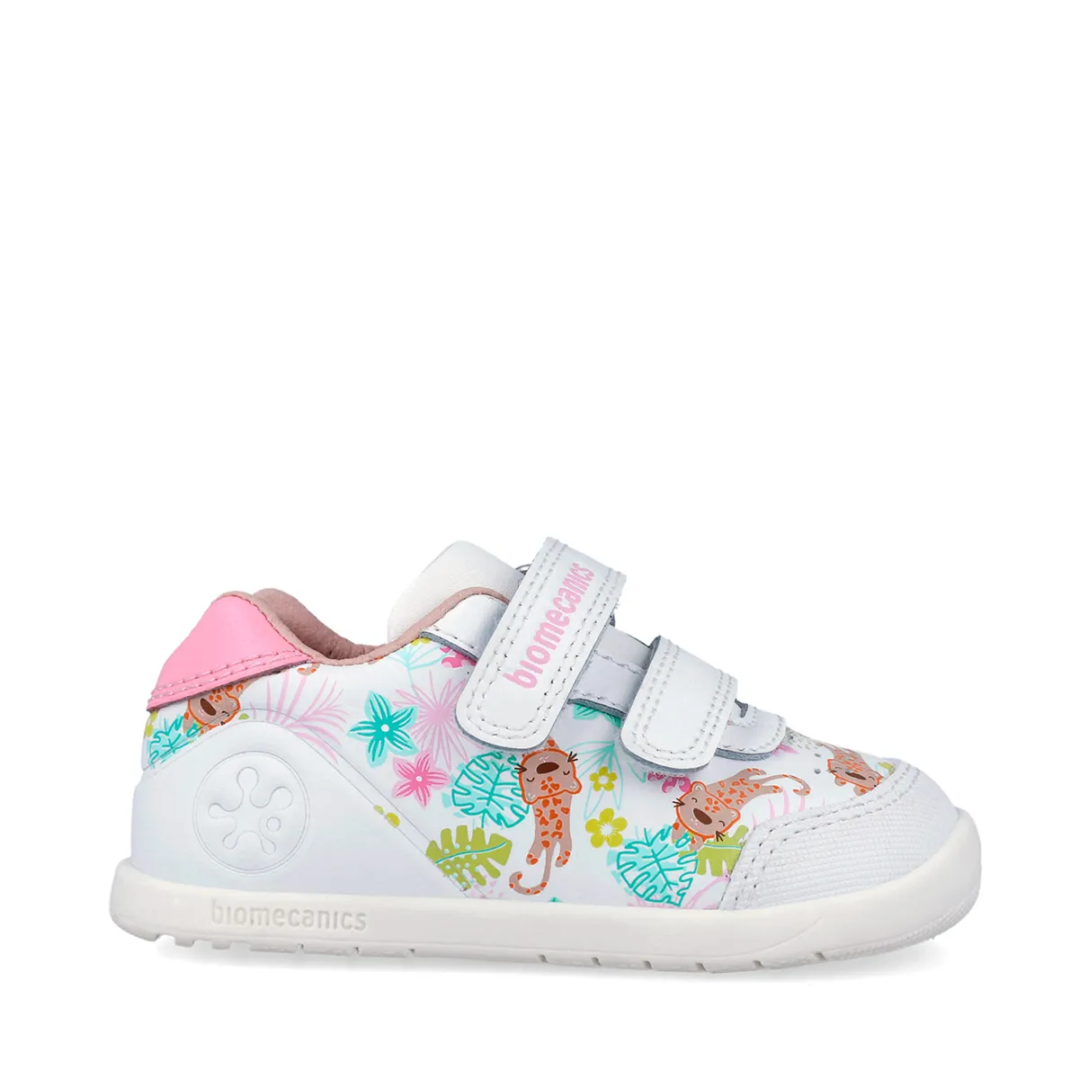 Parte din linia inovatoare Biomecanics Wider, acest model respectă 100% anatomia piciorului, oferind senzația de mers desculț. Sunt realizați din piele naturală albă cu un imprimeu exotic vesel (leoparzi și frunze) și accente roz. Talpa este complet plată (Zero Drop), subțire și flexibilă, iar vârful lat permite degetelor să stea răsfirate natural, fără constrângeri.