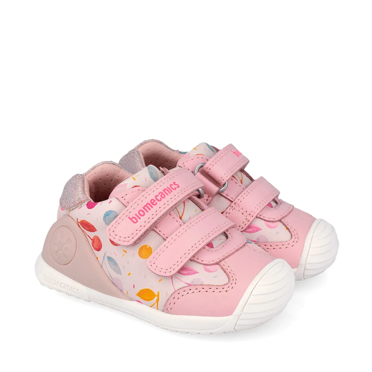 Acești pantofi din gama Biomecanics Biogateo aduc un plus de culoare ținutelor de zi cu zi, având un imprimeu jucăuș cu motive fructate și detalii subtile metalizate la călcâi. Sunt concepuți special pentru etapa „Primii Pași”, oferind echilibrul perfect între stabilitate și libertate de mișcare.