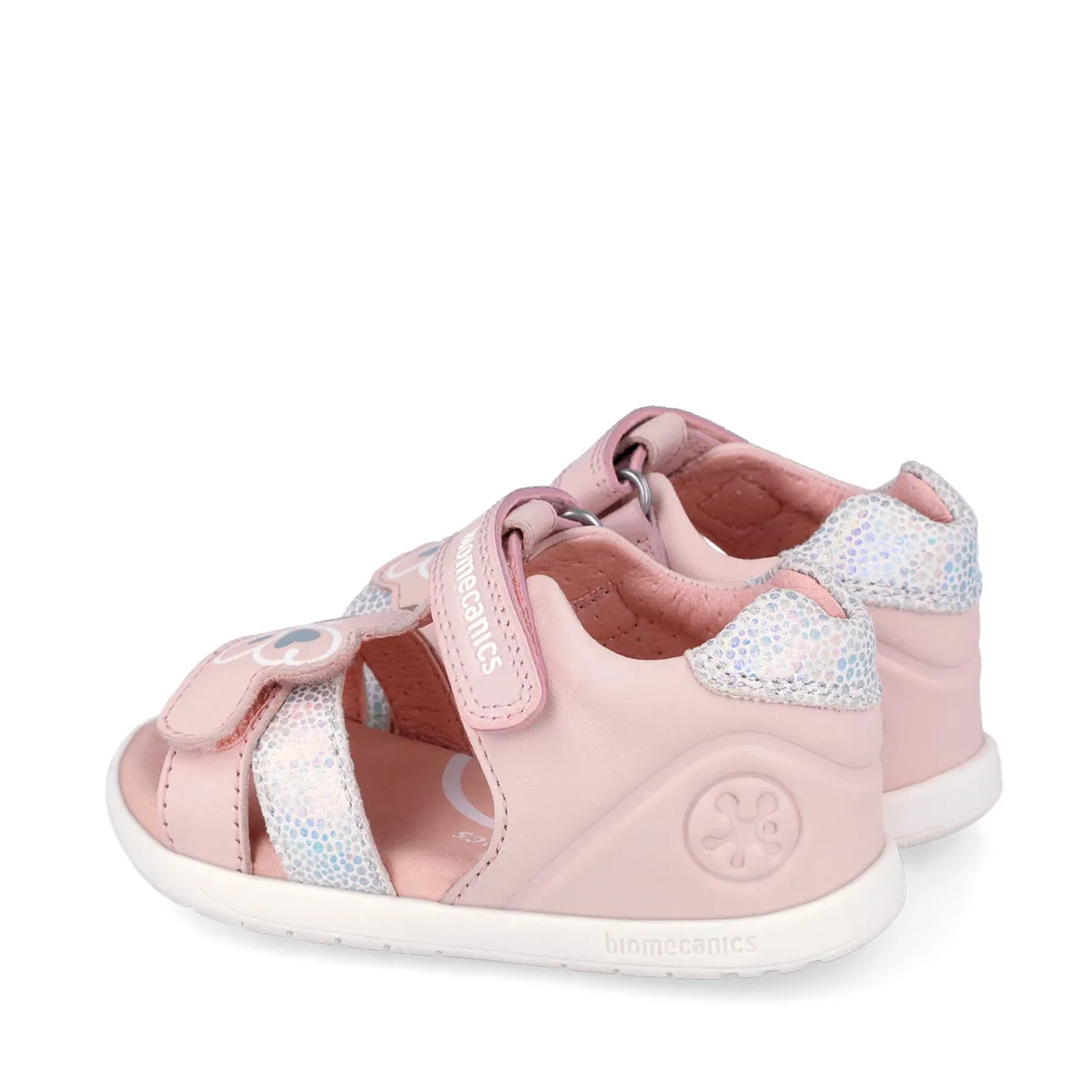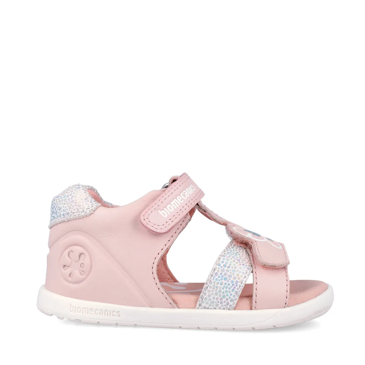 Sandale cu vârf deschis din gama Biomecanics Wider (Barefoot), perfecte pentru zilele toride de vară. Sunt realizate din piele naturală roz pudrat, având o baretă frontală reglabilă decorată cu un fluture stilizat și accente argintii/glitter. Fiind un model cu vârf deschis, oferă ventilație maximă și libertate absolută degetelor. Talpa este complet plată, iar fixarea pe gleznă se face rapid cu velcro.