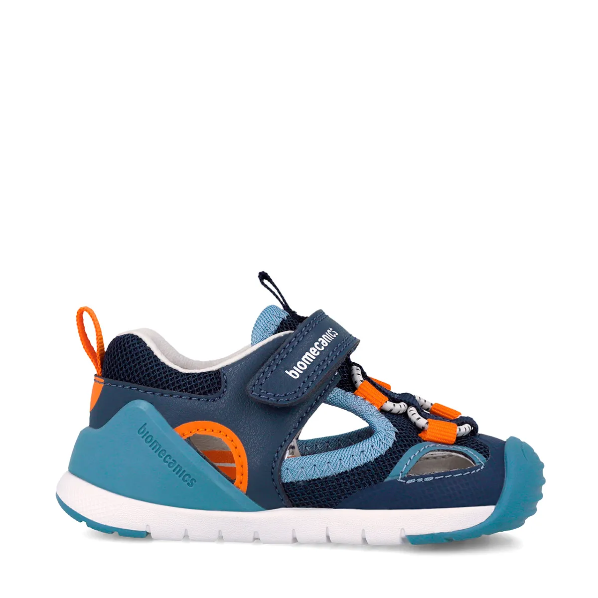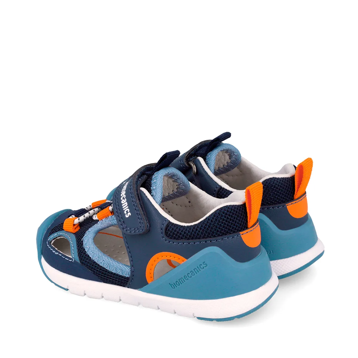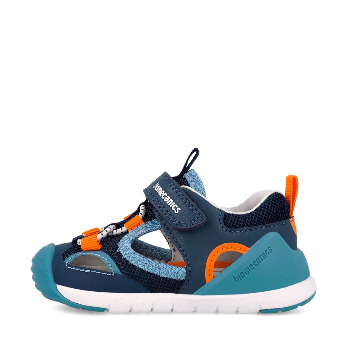 Model hibrid (pantof-sandală) din material textil bleumarin, extrem de aerisit datorită decupajelor laterale. Vârful și călcâiul sunt protejate de cauciuc rezistent (nuanță albastru-petrol), iar designul este animat de șireturi elastice și accente portocalii. Se închide rapid cu o baretă velcro, oferind siguranța unui pantof sport și răcoarea unei sandale.