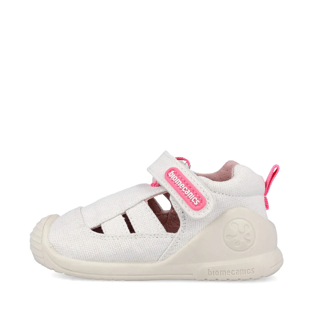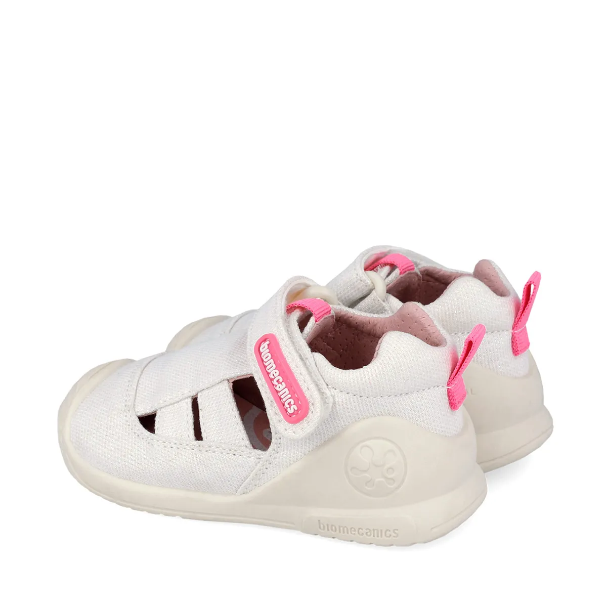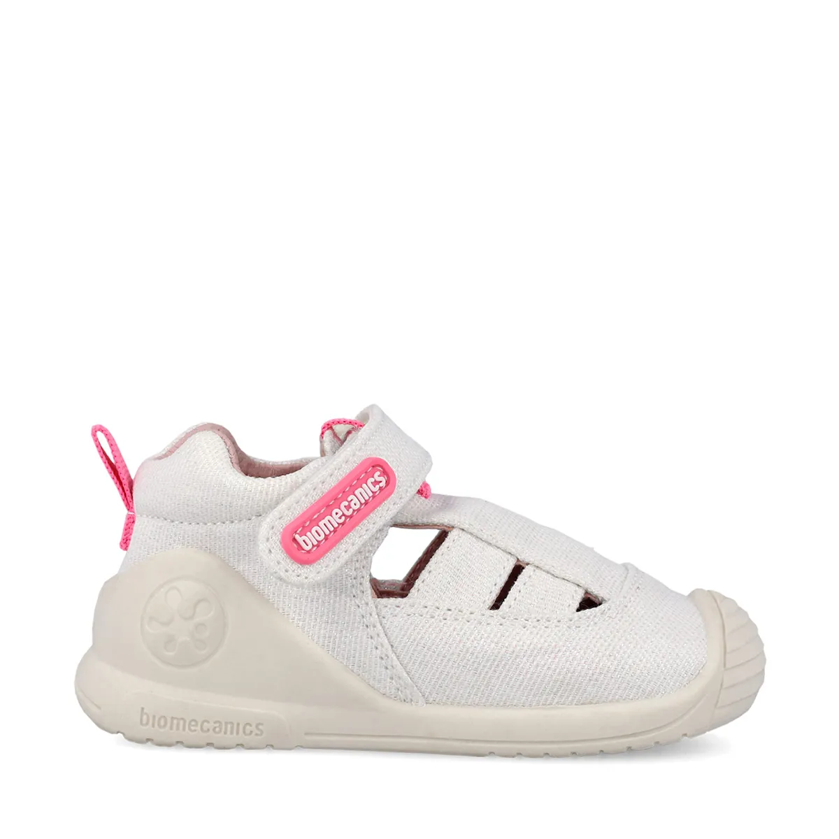 Oferă-i micuței tale confortul suprem cu aceste sandale ultra-ușoare din colecția Biomecanics Biogateo Canvas. Realizate dintr-un material textil tehnic, alb, cu o textură fină și detalii roz vibrante, acește sandale sunt soluția ideală pentru zilele toride când piciorul are nevoie de protecție, dar și de aerisire maximă.