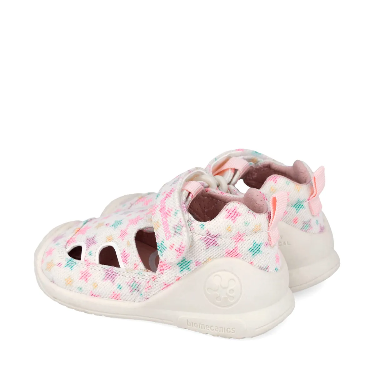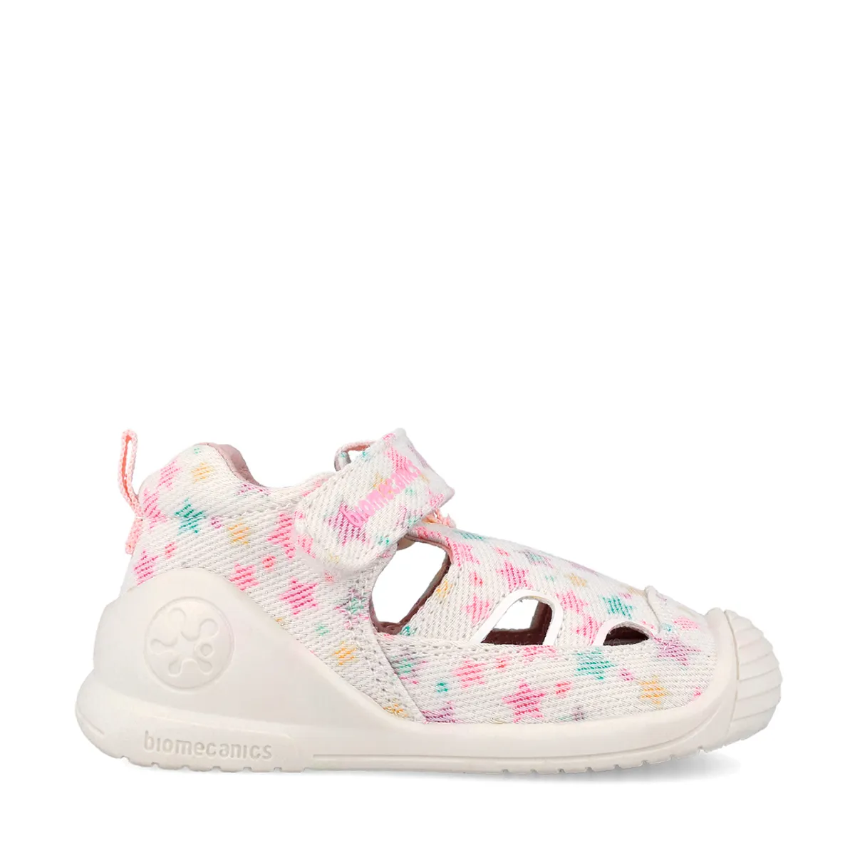 Sandale fete Biomecanics, material textil, talpa flexibila, protectie degete, Biogateo Canvas, alb cu imprimeu
