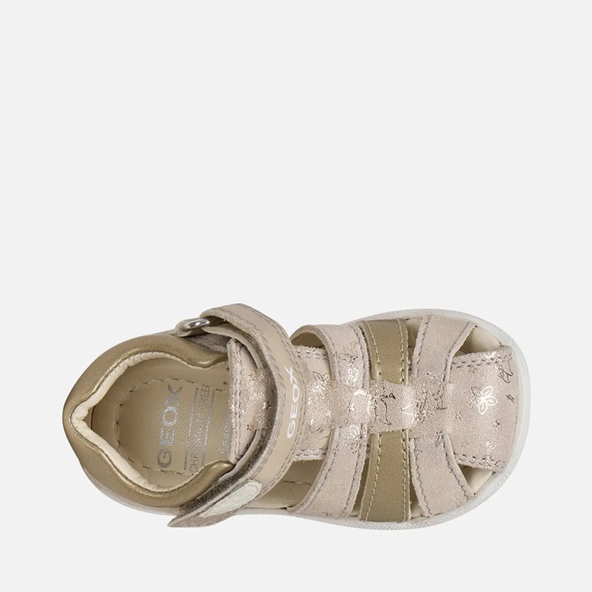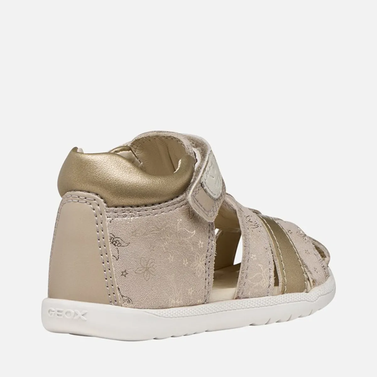 Sandale pentru primii pași, destinate fetițelor, confortabile și respirabile, cu un aspect casual și relaxat. Prezentat aici în varianta bej cu elemente grafice platină, modelul Macchia dispune de o căpută realizată din piele întoarsă ștanțată și material din piele cu efect perlat, având vârful tip "cage" și călcâiul închis. Talpa exterioară flexibilă, durabilă și antiderapantă asigură o stabilitate sporită pentru a o însoți în primele sale descoperiri.