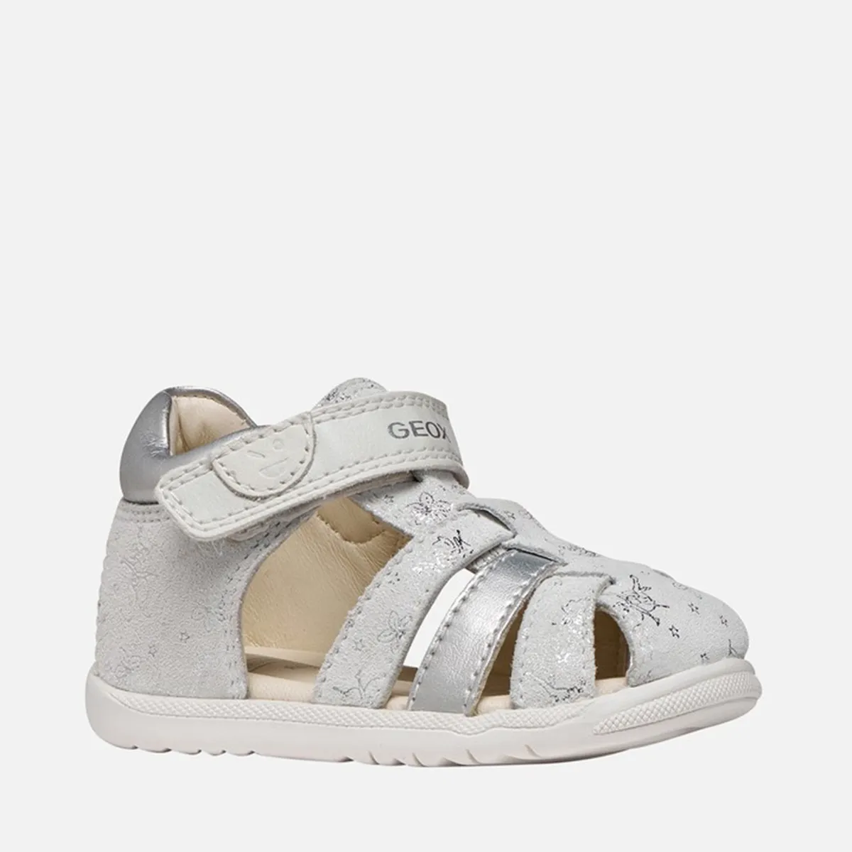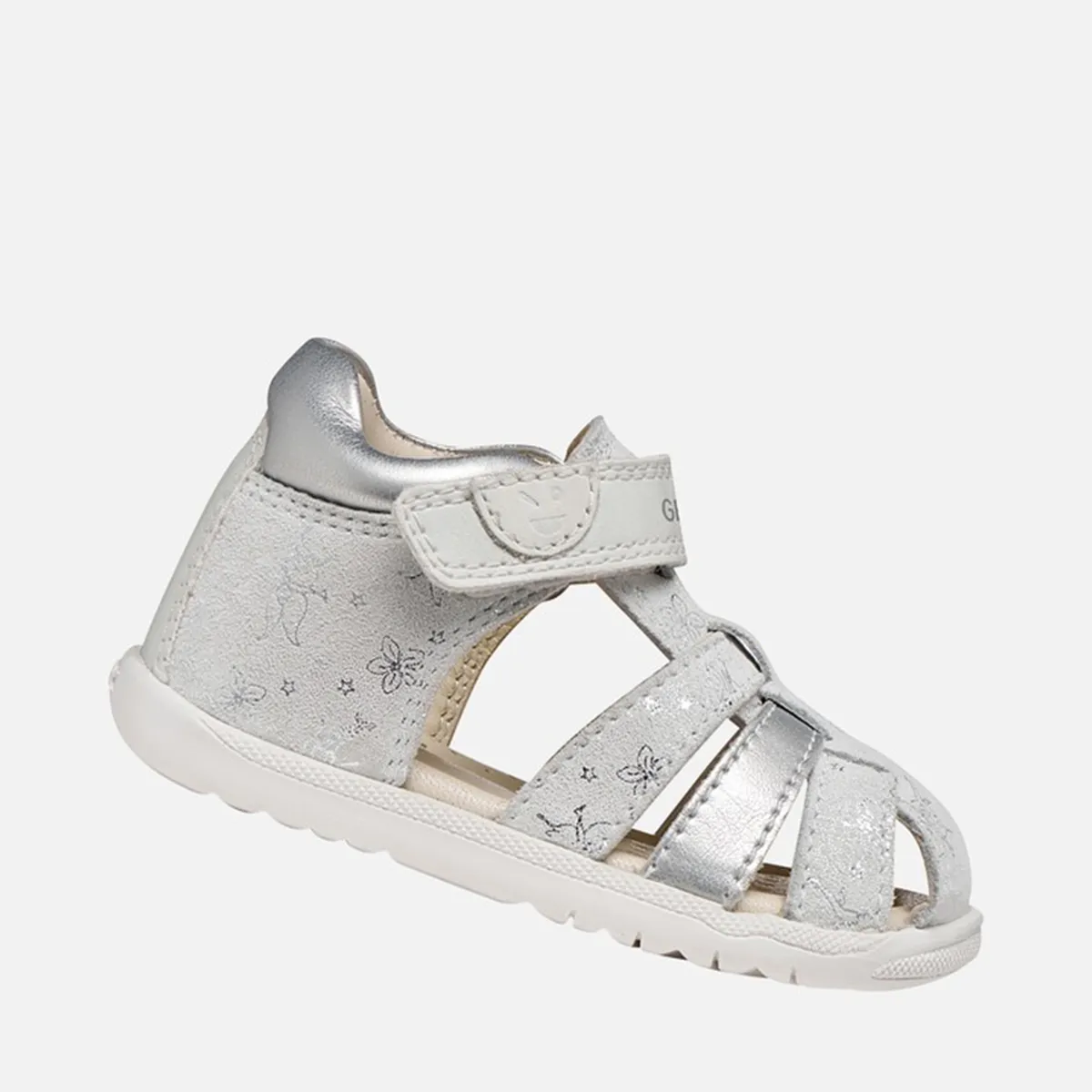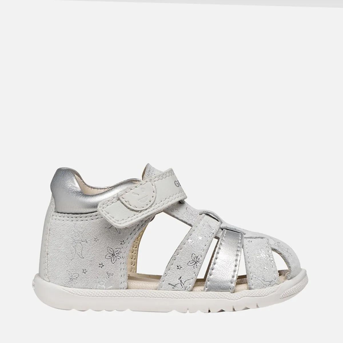 Sandale confortabile și respirabile pentru primii pași ai fetițelor, cu un look relaxat și dezinvolt. Prezentat aici în varianta albă cu motive argintii, modelul Macchia arborează o căpută din piele întoarsă imprimată și material cu efect de piele perlată, având vârful tip "cage" și călcâiul închis. Talpa exterioară flexibilă, rezistentă și antiderapantă garantează un sprijin sigur, pentru a însoți primele sale descoperiri.