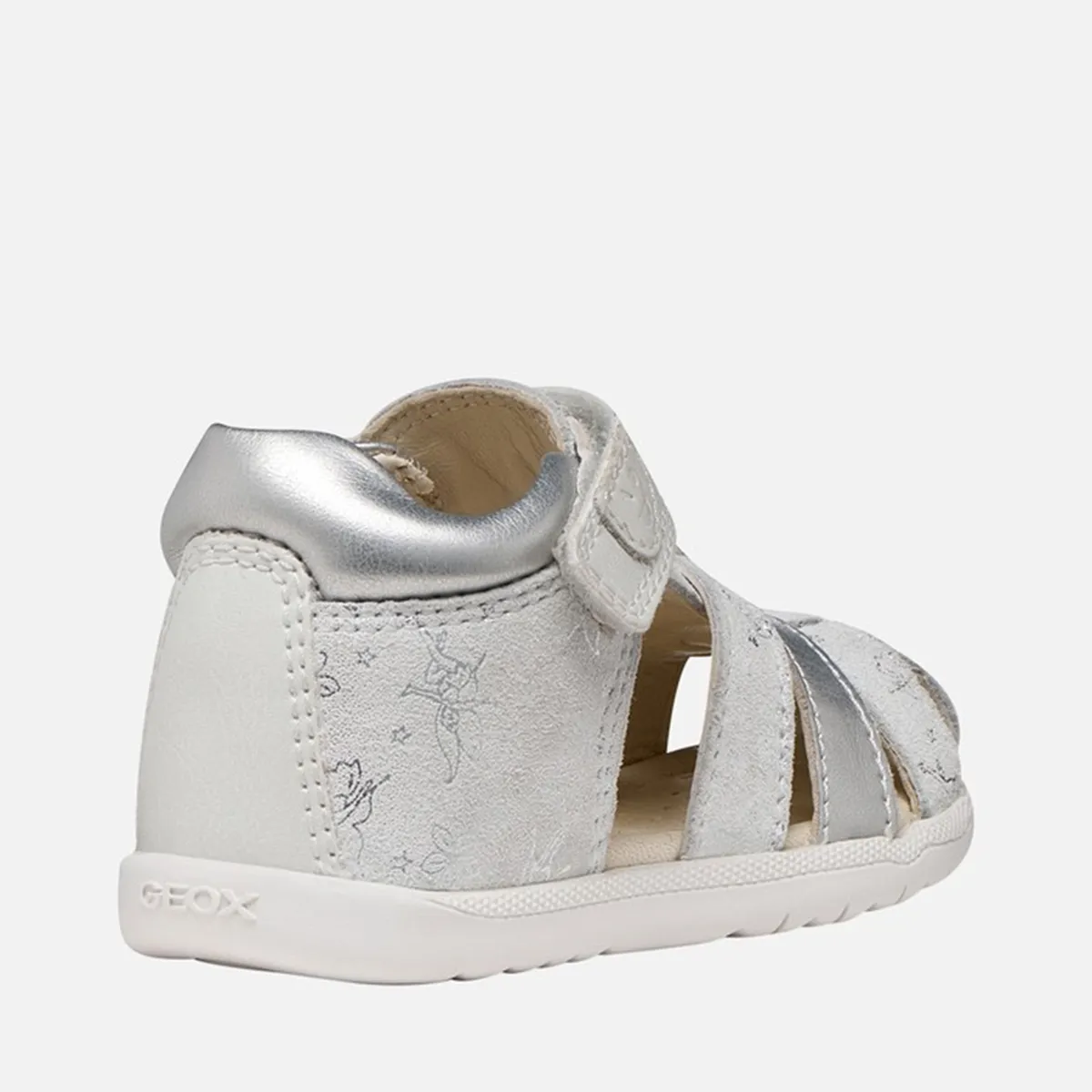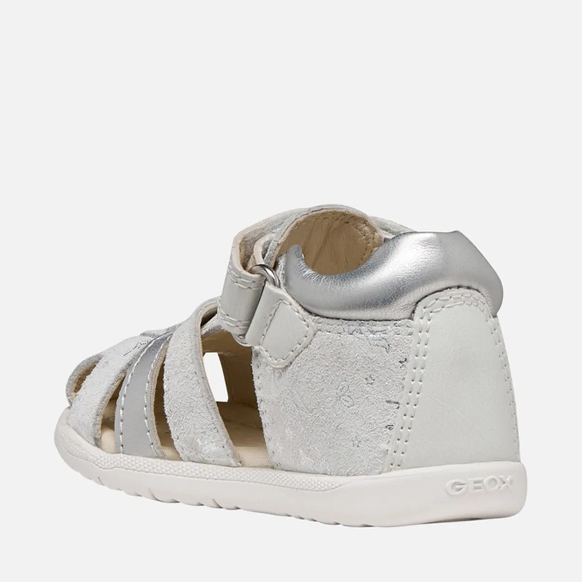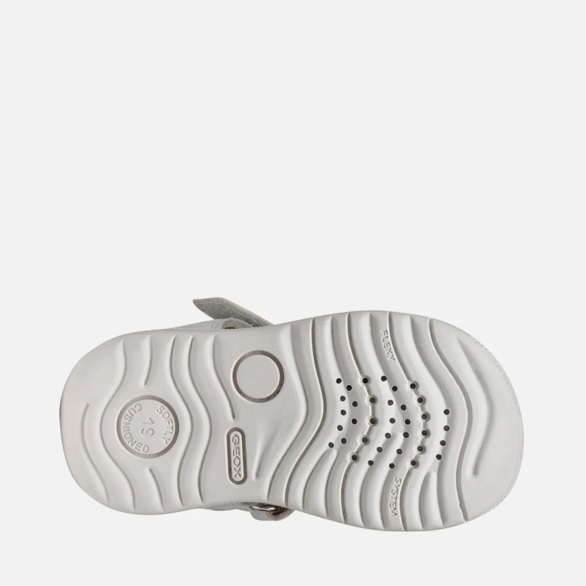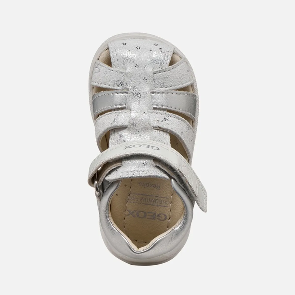 Sandale confortabile și respirabile pentru primii pași ai fetițelor, cu un look relaxat și dezinvolt. Prezentat aici în varianta albă cu motive argintii, modelul Macchia arborează o căpută din piele întoarsă imprimată și material cu efect de piele perlată, având vârful tip "cage" și călcâiul închis. Talpa exterioară flexibilă, rezistentă și antiderapantă garantează un sprijin sigur, pentru a însoți primele sale descoperiri.